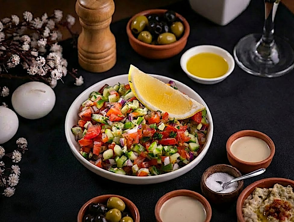 סלט ירקות ערבי קצוץ דק עם מלפפון, עגבניה, פטרוזיליה, בצל סגול.