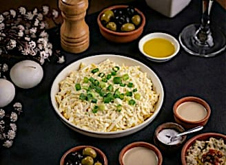 סלט שאי אפשר להפסיק לאכול עם תפו"א, ביצים, מלפפון חמוץ ועירית במיונז.