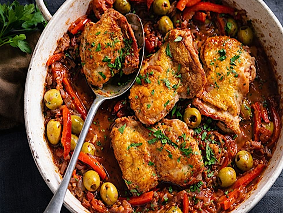 תבשיל פרגיות עם זיתים, פלפל ועגבניות - פרגיות, עגבניות שרי, זיתים ירוקים מגולענים, פלפלים, שום, שמן זית, אריסה, דבש, פפריקה מתוקה, כמון, מלח, פלפל שחור, מיץ תפוזים, כוסברה.