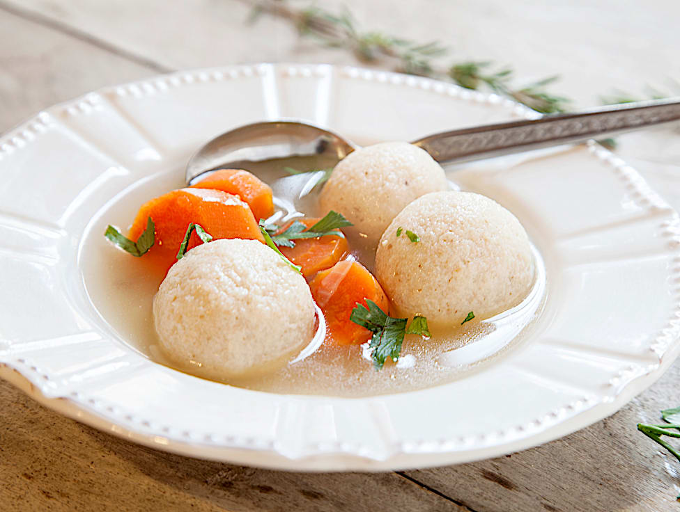 מרק עוף עשיר, המתבשל באיטיות עם ירקות שורש ועשבי תיבול, עם כדורי קניידלך רכים ואווריריים.
