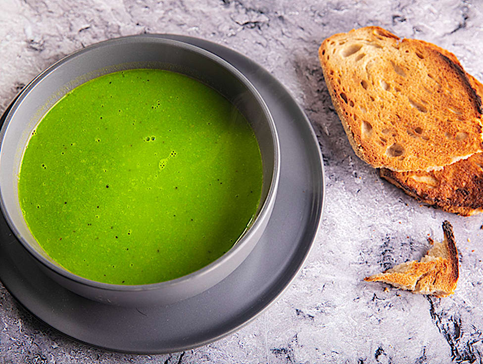 מרק חלק על בסיס אפונה טרייה (לא הקטנייה היבשה) וירקות שורש.