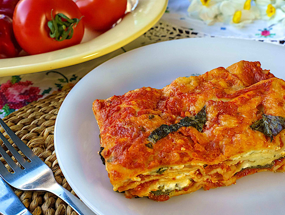 לזניה חלבית ועשירה עם רוטב עגבניות סמיך, מנגולד ורוטב בשמל