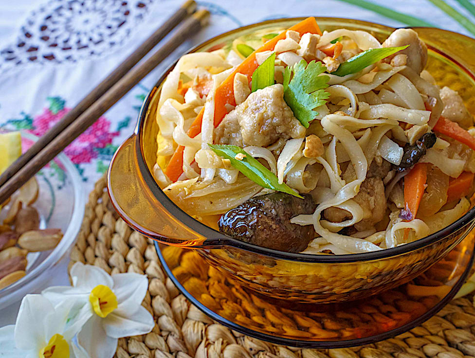 נתחי פרגית עסיסיים מוקפצים בווק בתוך חגיגה של ירקות - בצל, גזר, כרוב, קישוא, מנגולד, ברוקולי וכוסברה עם אטריות ביצים, בתיבול אסיאתי לצד בוטנים קצוצים
