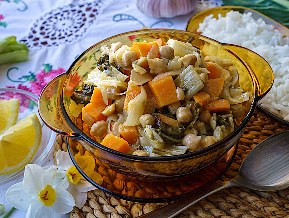 תבשיל גרגרי חומוס, מנגולד, כרישה וקוביות בטטה- טבעוני