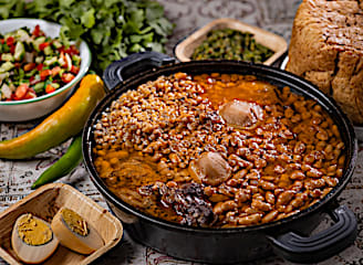 שעועית, בצל, תפוחי אדמה, גריסי פנינה, ביצים, בבישול ארוך