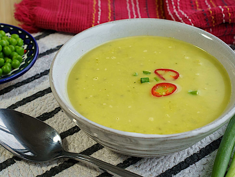 אפונה יבשה, אפונה טרייה, בצל, סלרי, תפוח ירוק, קרם קוקוס, כוסברה