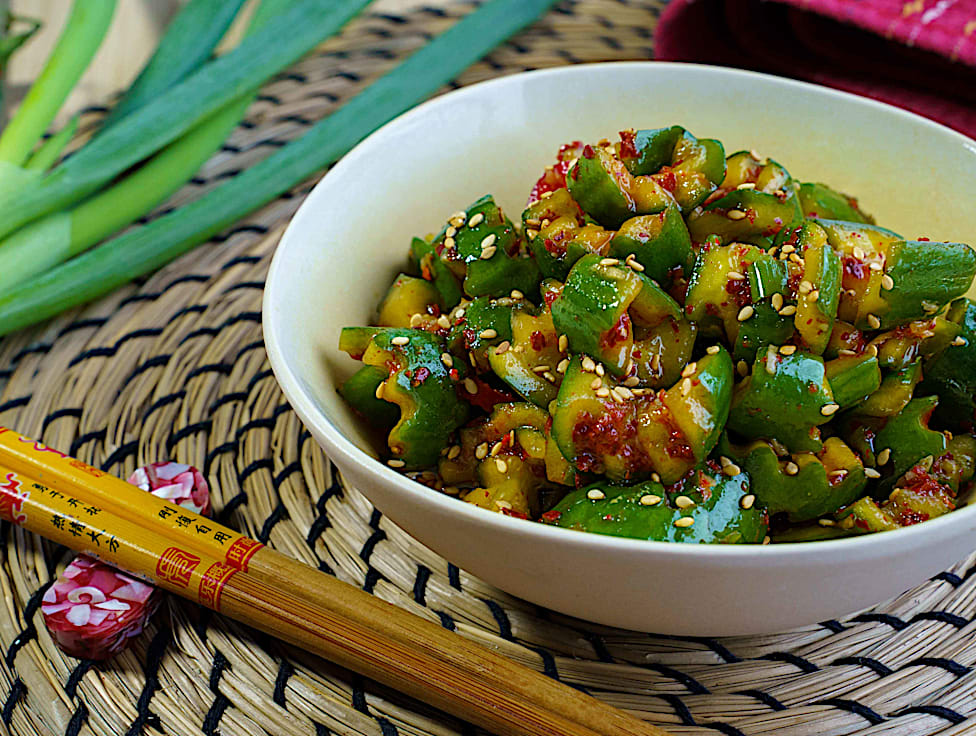 מלפפונים, אבקת צ'ילי קוריאני, שומשום, חומץ אורז, רוטב דגים ושמן שומשום