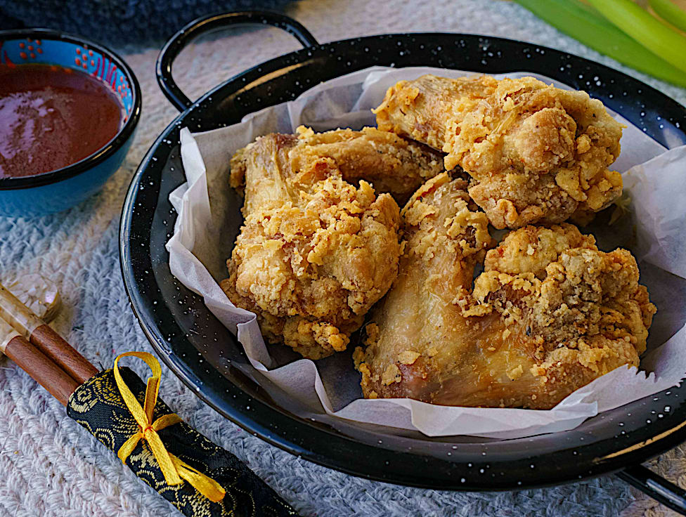 כנפיים, ציפוי קורנפלור וקמח.