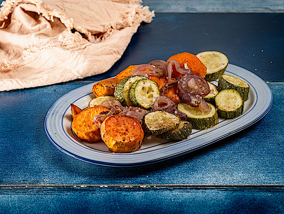 אנטיפסטי ירקות אפויים - קישוא, בטטה ובצל סגול - קישוא, בטטה, בצל סגול, שמן זית, שום, מלח, פלפל שחור.