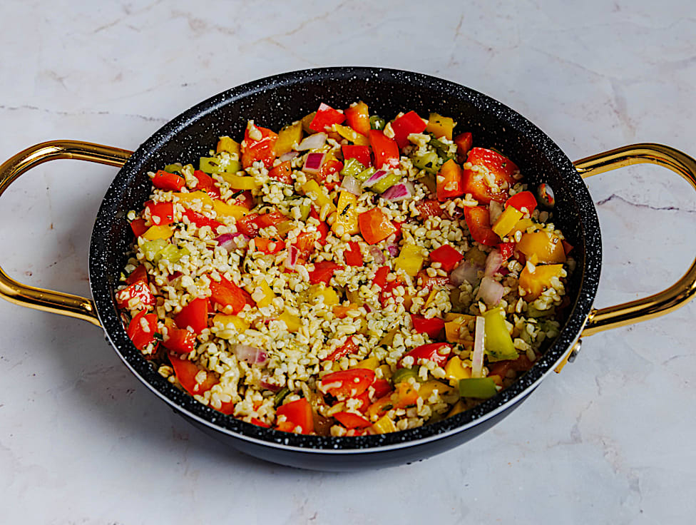 סלט רענן על בסיס בורגול , עשיר בירקות- פלפלים בצבעים, בצל סגול , פלפל חריף , כוסברה, עם רוטב שמן זית ולימון בצד