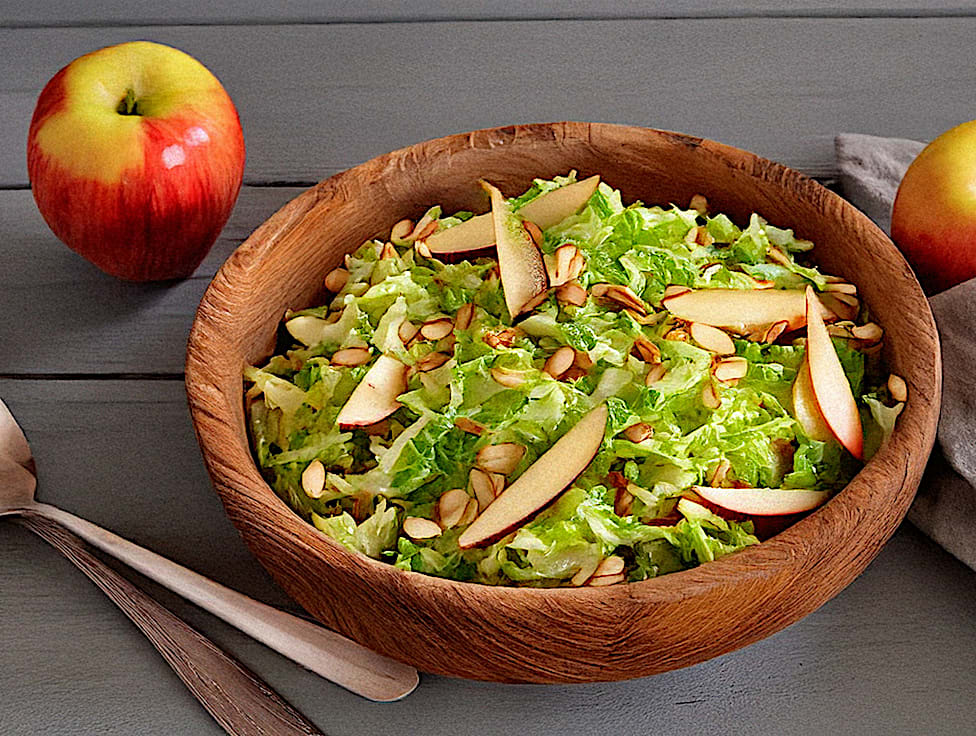 כרוב לבן, תפוחי עץ פרוסים, שקדים קלויים, בצל ירוק, שמן זית, לימון, תבלינים.