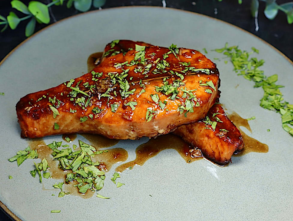 נתחי פילה סלמון טרי צרובים בגריל ביחד עם טבעות של בצל לבן ברוטב צ'ילי-סויה מתוק ומשגע !