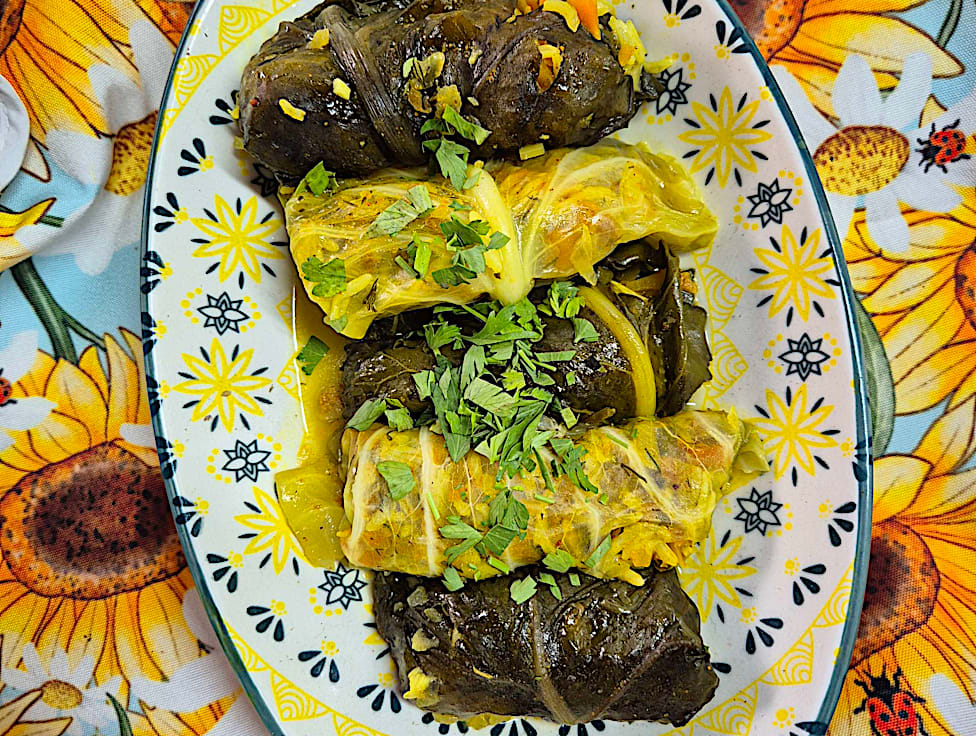 עלי כרוב ומנגולד ממולאים אורז, בשר טחון, ירקות ועשבי תיבול (נענע, כוסברה, פטרוזליה)מבושלים ברוטב חמצמץ או ברוטב עגבניות** לא מכיל גלוטן עד רמת התבלינים, כלים נקיים ואריזה נפרדת (הסביבה אינה סטרילית מגלוטן)