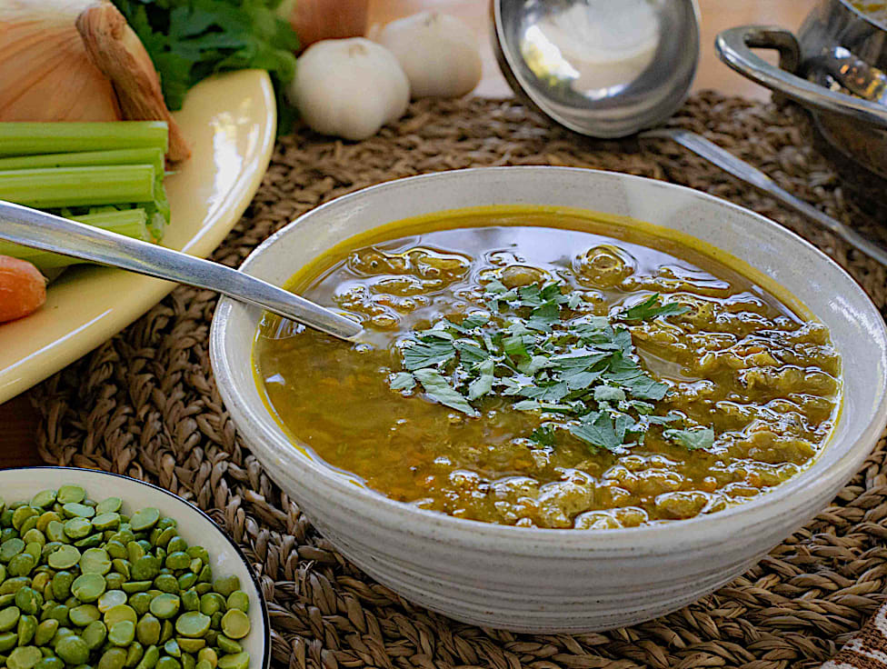 מרק אפונה סמיך ומנחם. האפונה מבושלת עם ירקות טחונים ותבלינים ויוצרות מרק עשיר שכולם אוהבים לאכול.