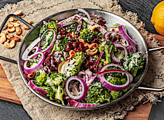 סלט כרוב סגול אסייתי עם בצל ירוק, שומשום קלוי, בוטנים שבורים וקלויים בתיבול מתקתק של רוטב סויה, שמן שומשום, דבש וחמאת בוטנים טבעית