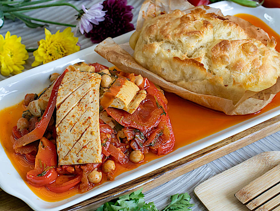 טופו מבושל ברוטב אדום חריף, עם עגבניות פלפלים שום וחומוסים. מתובל בשמן, פפריקה וכוסברה טרייה.