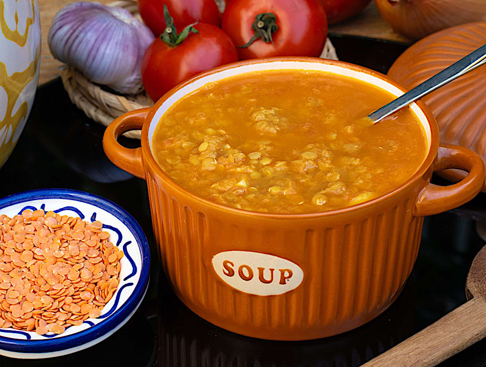 מרק עדשים אדומות, הרבה שום, עגבניות ולימון. מרק מנחם ומזין.