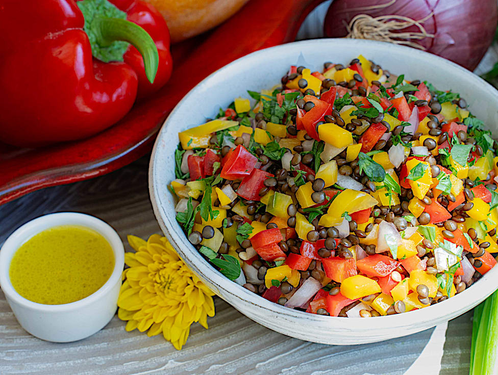 עדשים שחורות, פלפלים בצבעים, פלפל חריף, בצל סגול ופרי בהתאם לעונה. כוסברה ונענע קצוצים. ברוטב הדרים חמצמץ.