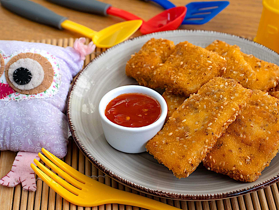 שניצל טופו בבלילת קורנפלור ומעט סויה דלת נתרן, בציפוי קריספי של פירורי לחם ושומשום.
