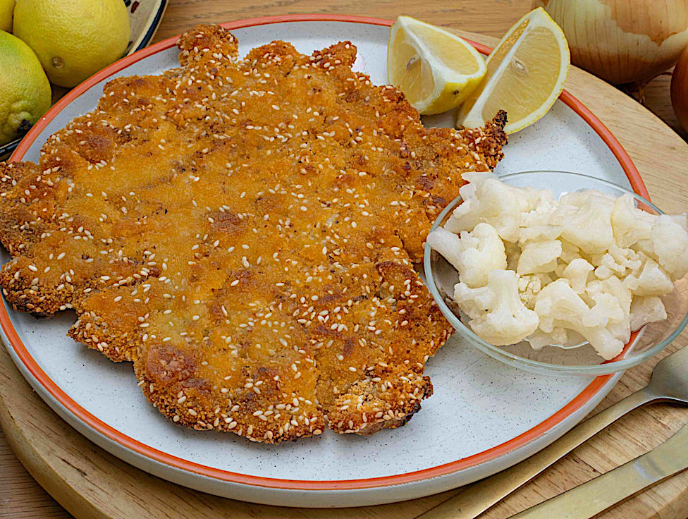 מיני כרובית בבלילת ביצה ותבלינים, מצופה בפירורי לחם, משוטחת על נייר אפייה ונאפת בתנור עם מעט שמן זית- ממש כמו שניצל