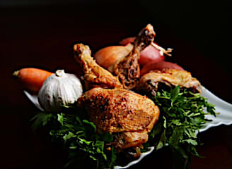 נתחוני חזה עוף מוקפצים בשמן זית עם פטריות טריות, בצל שום, תבלינים ויין לבן מצומצם.