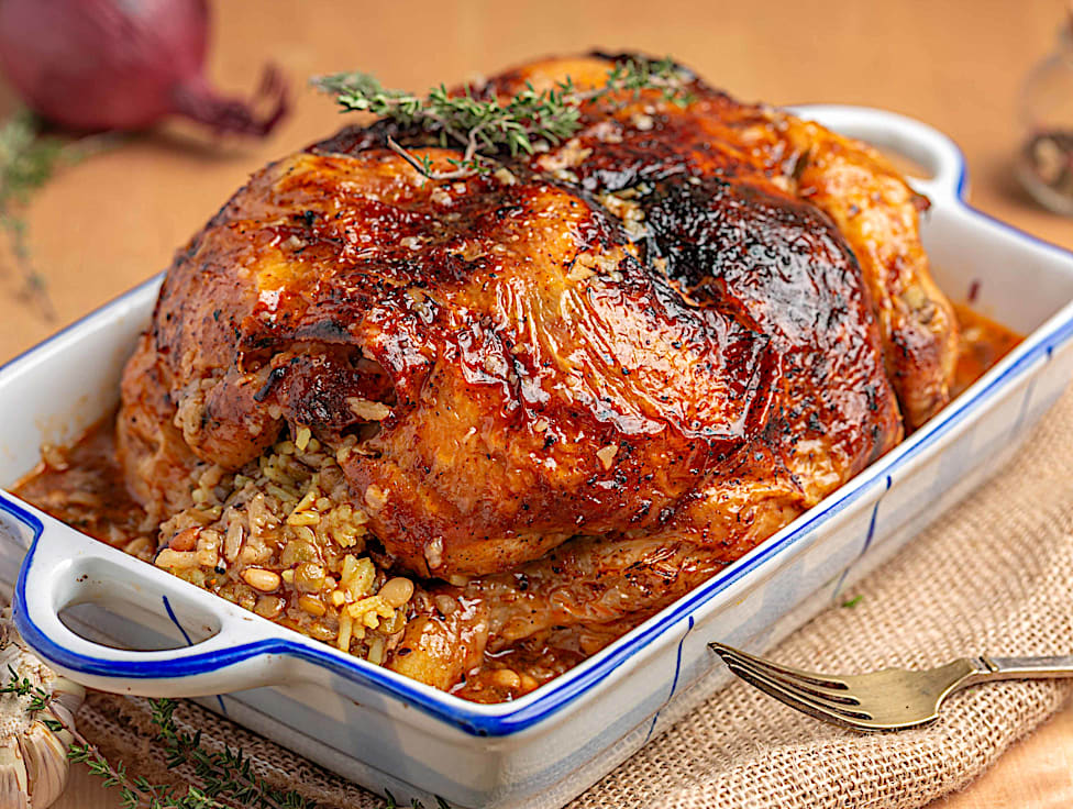 עוף שלם בתנור בבישול ארוך,ממולא אורז מתובל,פטריות מוקפצות, בצל וצנוברים קלויים.