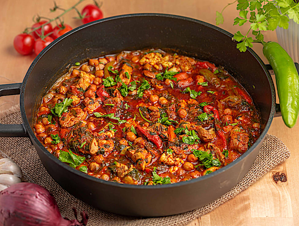 שקדי עגל בבישול ארוך ברוטב עגבניות חרפרף עם חומוס, פלפלים ושום. רך, עשיר ומלא טעם.