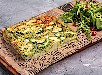 לזנייה גבינות ברוטב נפוליטנה ביתי, בטטה, זיתי קלמטה, גבינת פטה, פלפל קלוי ובזיליקום מהגינה
