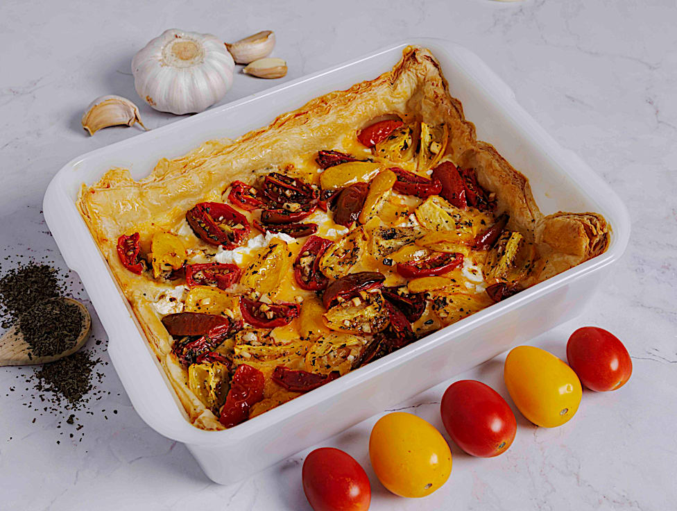 מאפה בטעם מעודן עם שלוש סוגי גבינה ועגבניות שרי במבחר צבעים