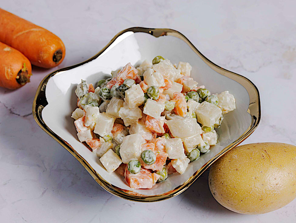 גזר,שורש סלרי,שורש פטרוזיליה,אפונה,מלפפון חמוץ,מיונז,שמנת חמוצה,מלח,פלפל