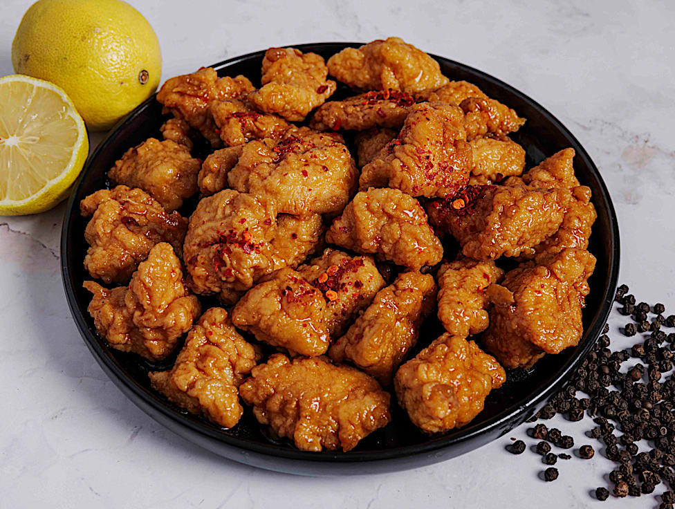 קוביות חזה עוף מטוגנות בבלילה עם קורנפלור ומבושלות ברוטב לימון עדין מתקתק