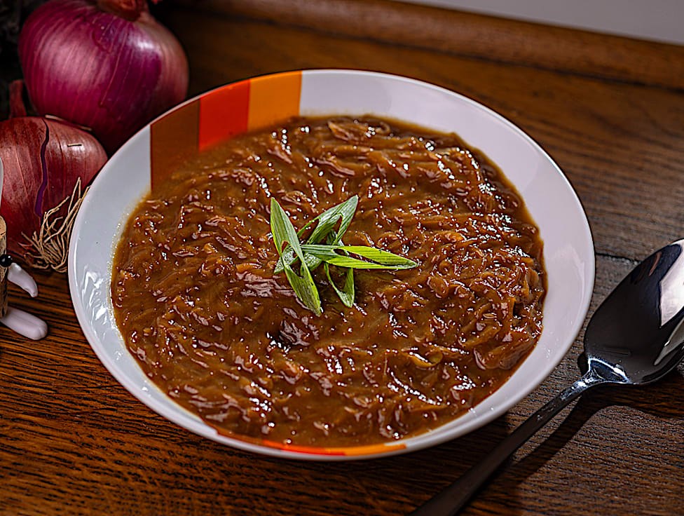 המון בצל מקורמל במשך שעות עד להשחמה עמוקה, ואז מבושל ביין לבן וציר בקר. מרק חורפי קלאסי, עשיר ומנחם.** לא מכיל גלוטן עד רמת התבלינים, כלים נקיים ואריזה נפרדת (הסביבה אינה סטרילית מגלוטן)