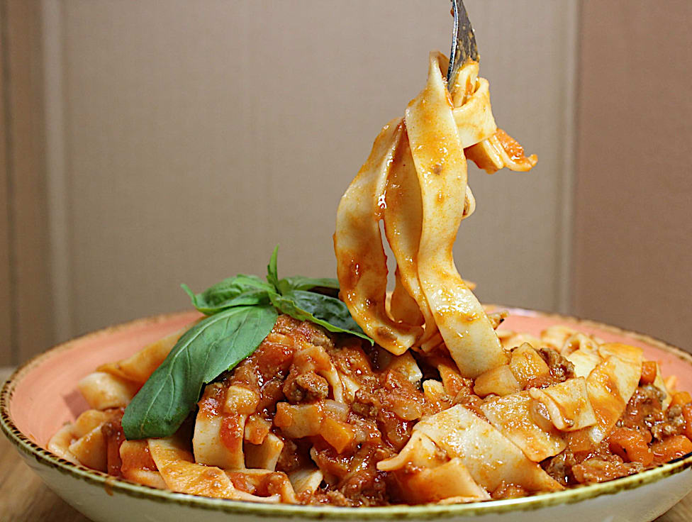 ספגטי בולונז - בשר טחון,רוטב עגבניות,בצל,גזר,סלרי,בזליקום,תימין,פסטה