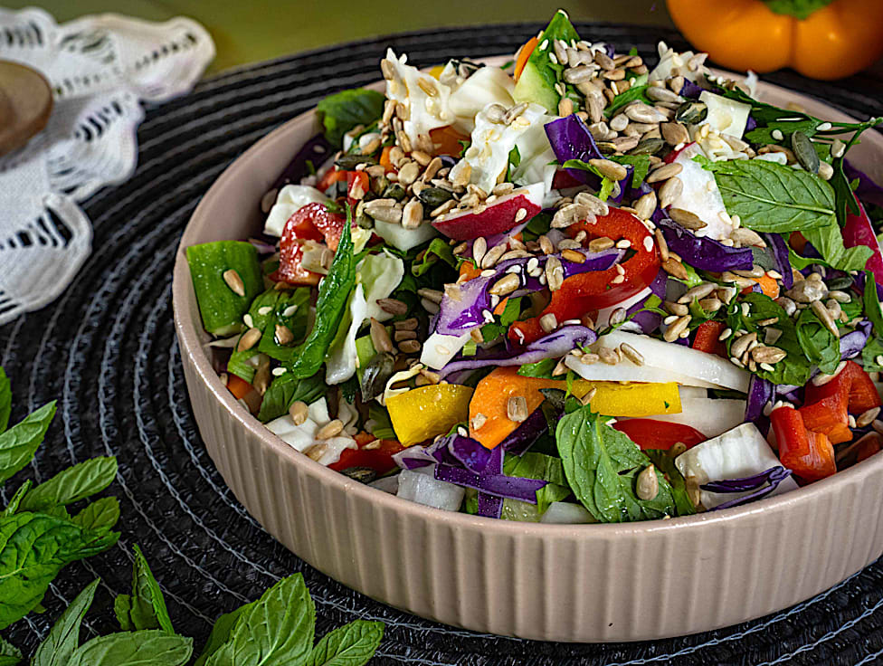סלט עשיר ומגוון של ירקות צבעוניים וחיוניים. שפע של בריאות וטעם נפלא