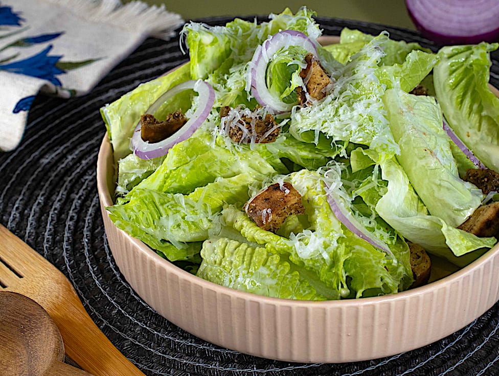 סלט פריך ומרענן, חסה ובצל סגול שנעטפים ברוטב קיסר עם אנשובי פרמז'ן לקיק האולטימטיבי