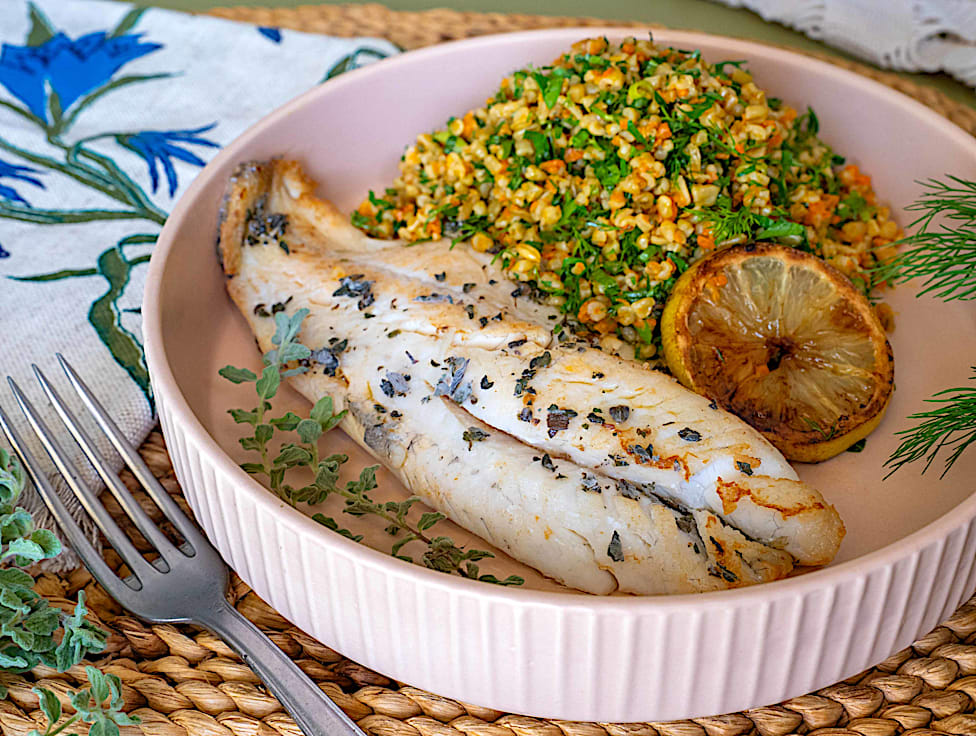 פילה לברק צרוב במחבת, מתובל בעדינות בזעתר ולימון לשמירה על טעם נקי ומדויק. ניתן וכדאי לשלב עם סלט פריקי מחיטה ירוקה מעושנת, עשיר בעשבי תיבול רעננים וירוקים.