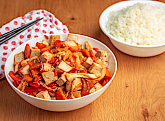 תבשיל עשיר של טופו, בצל, גזר וזוקיני ברוטב חריף וקרמי של קארי אדום עם חלב קוקוס.
