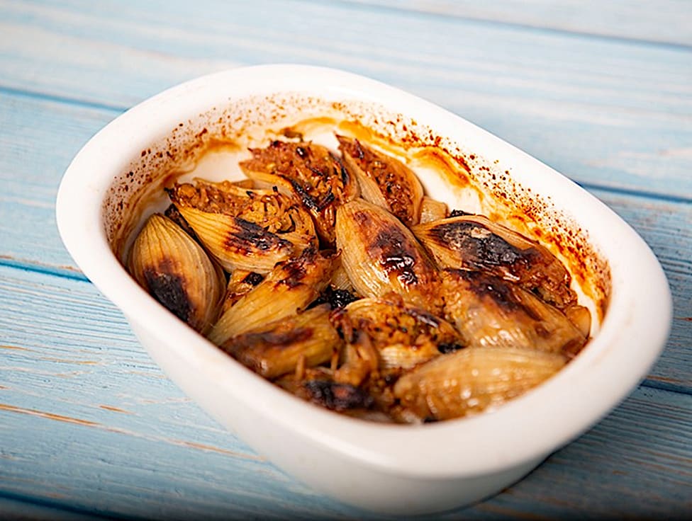 בצלים ממולאים באורז שקדים וצימוקים ברוטב מתוק - בצלים , אורז, שזיפים מיובשים, סילן, רכז רימונים, פטרוזיליה