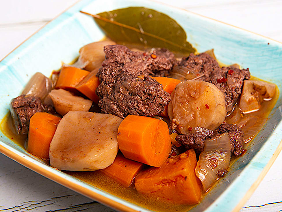 תבשיל של חלבון סויה עם ירקות שורש ביין אדום מתאים במיוחד לימי החורף החמים.