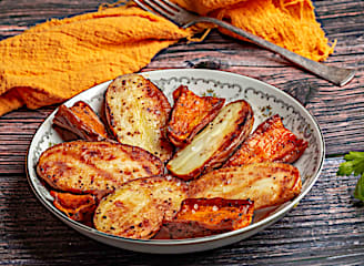 ירקות קלויים בתנור (פלפלים אדומים, קישואים, חצילים, בטטות, בצל, שום) בתיבול עדין של שמן זית מלח גס ופלפל גרוס