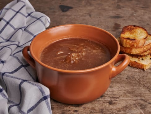 מרק בצל עשיר עם מספר זנים שונים של בצלים על בסיס ציר בקר ויין. מגיע בתוספת צנימים.