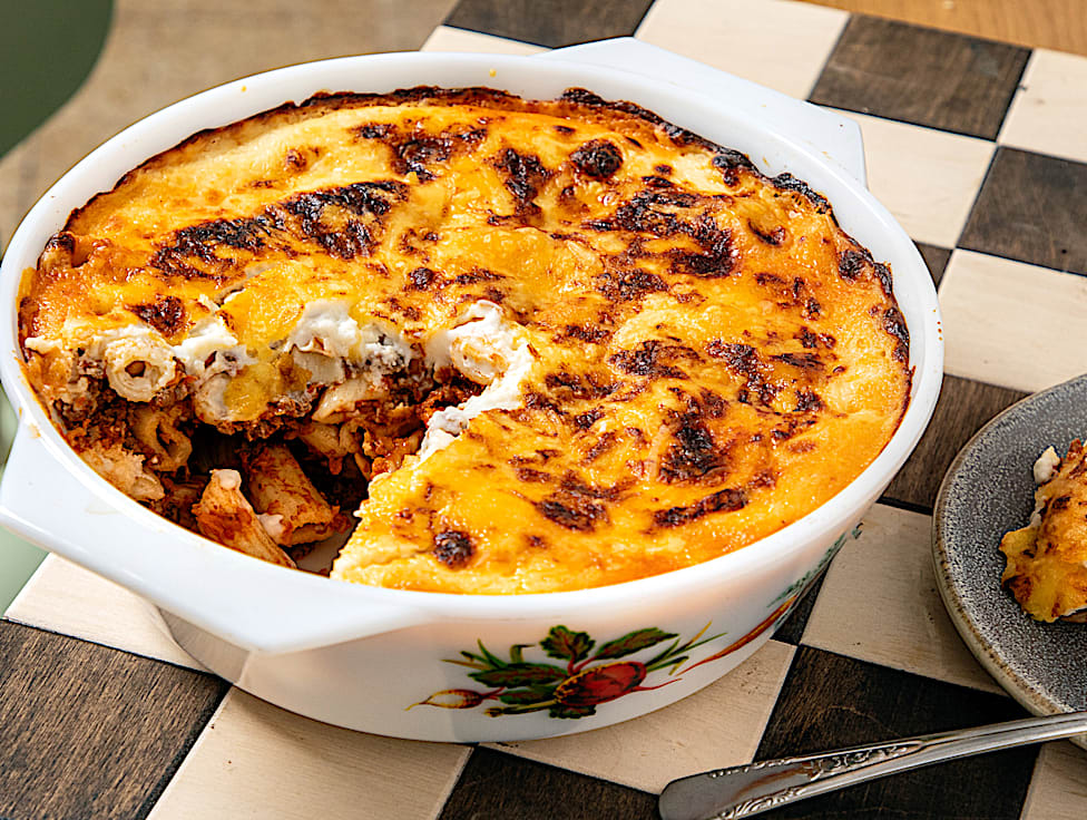 פסטה, רוטב בולונז, בשמל וגבינה מגוררת