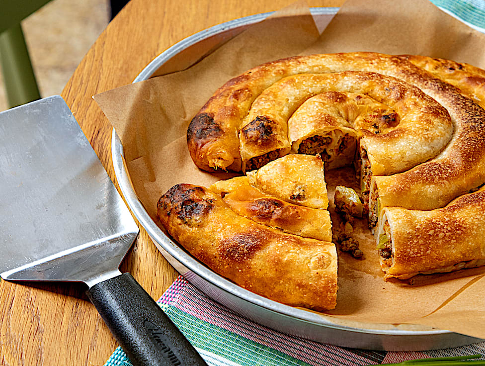 מאפה מבצק בהכנת יד, במילוי בשר טחון וירקות.