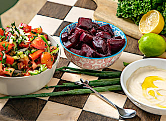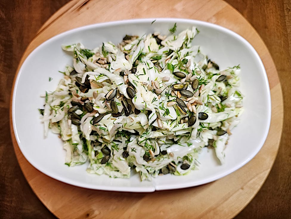 כרוב לבן, שמיר, בצל ירוק, גרעיני חמנייה ודלעת קלויים, שמן שומשום ולימון