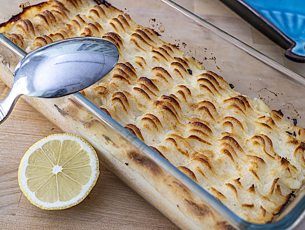 מאפה של נתחי סלמון ברוטב בשמל מתובל, עם שכבה של פירה תפו"א וגבינות אורירי.