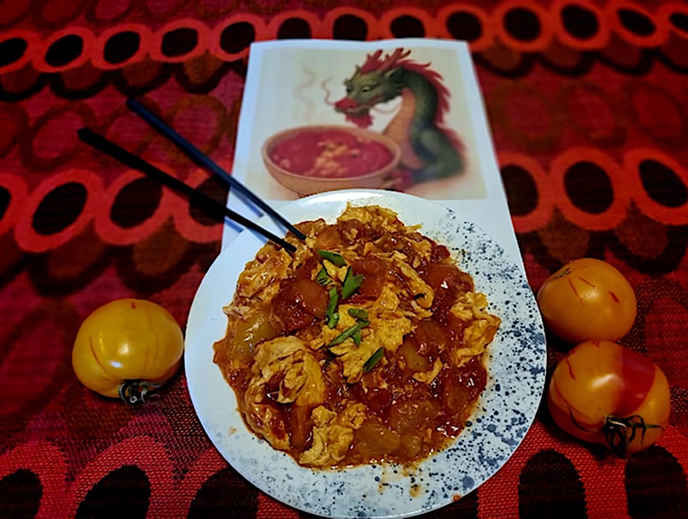 עגבניות טריות מוקפצות במהירות עם ביצים מקושקשות, סוכר חום וקמצוץ בצל ירוק (מנה עדינה ומתקתקה).