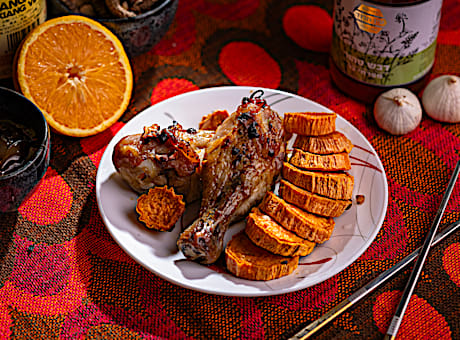 שוקי עוף צלויים בגריל במרינדת שום ודבש בתוספת בטטות - שוקי עוף, דבש, סוכר חום, סויה בהירה, יין אדום, שום, ג'ינג'ר, צ'ילי טרי, קורנפלור, בטטות, טימין, מלח, סוכר, שמן זית