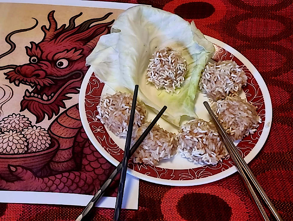 כדורי בשר טחון (עוף/בקר/לבן) מעורבבים עם ירקות קצוצים דק ועטופים באורז דביק, מתובלים בסגנון מקומי עדין ומאודים.