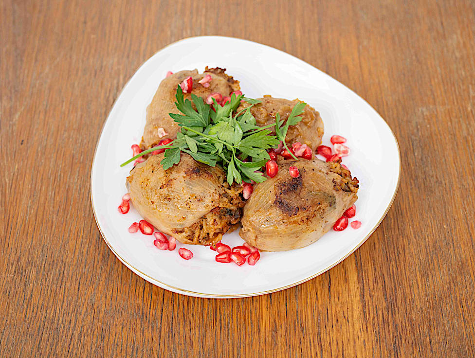 מנה של בצל ממולא באורז ובשר, עם רוטב עגבניות מתקתק וטעמי בהרט עדינים. מנה חגיגית ומנחמת