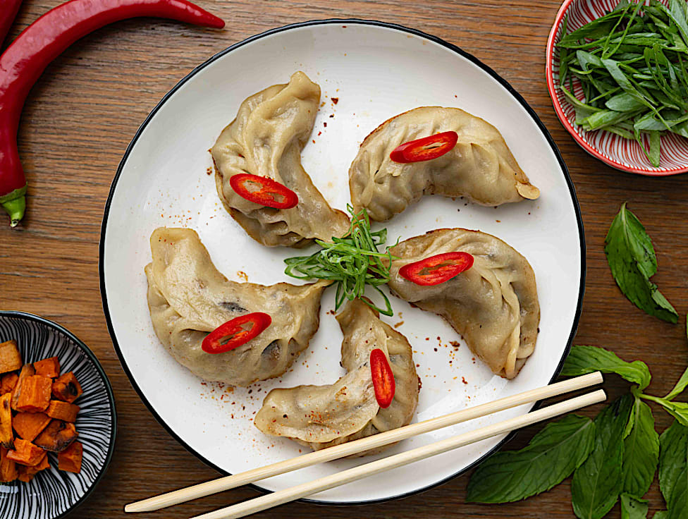 גיוזה בעבודת יד, מטוגנת ומאודה, במילוי של טופו פטריות ובצל / בטטה בצל ירוק ושום.